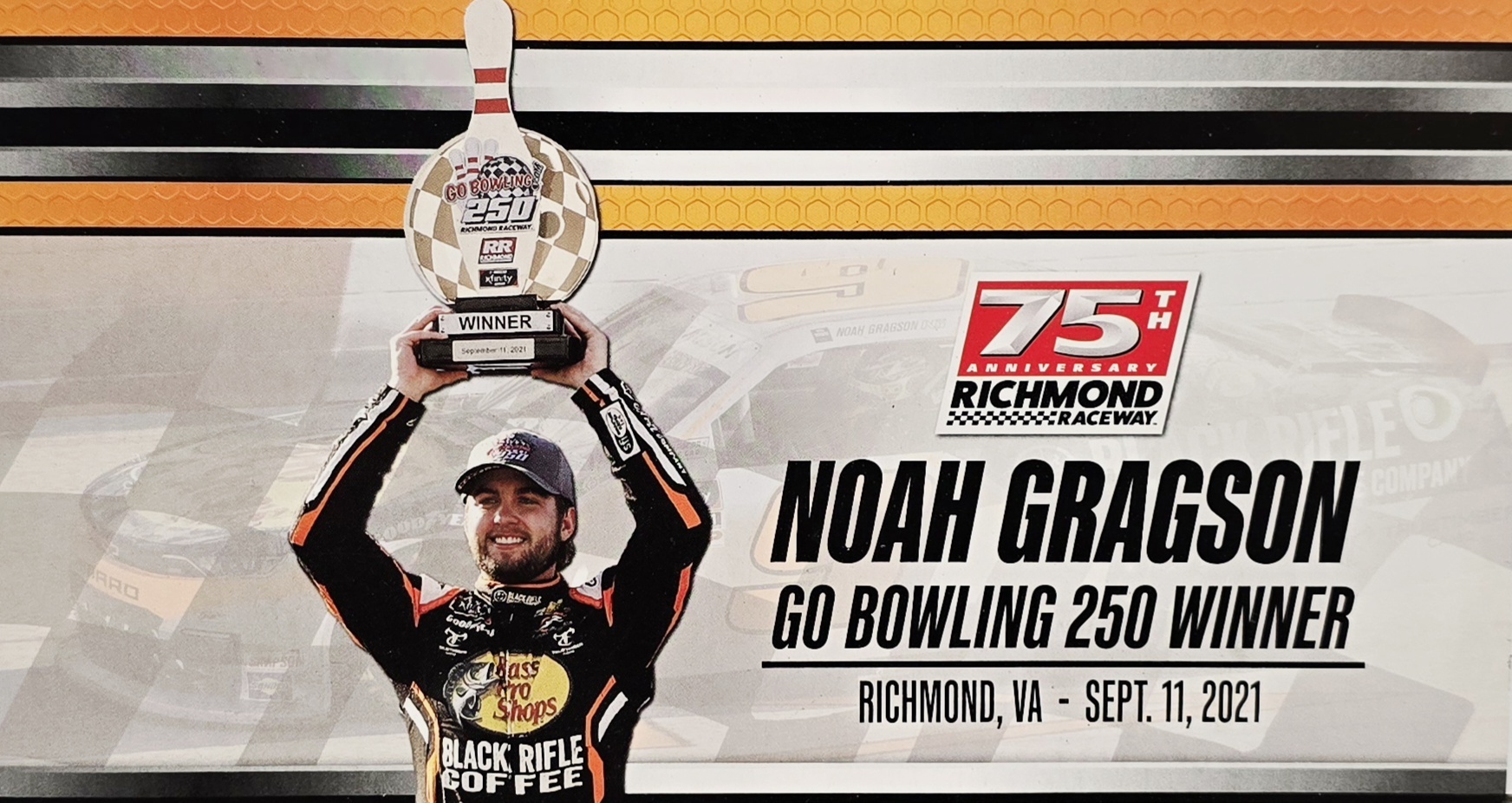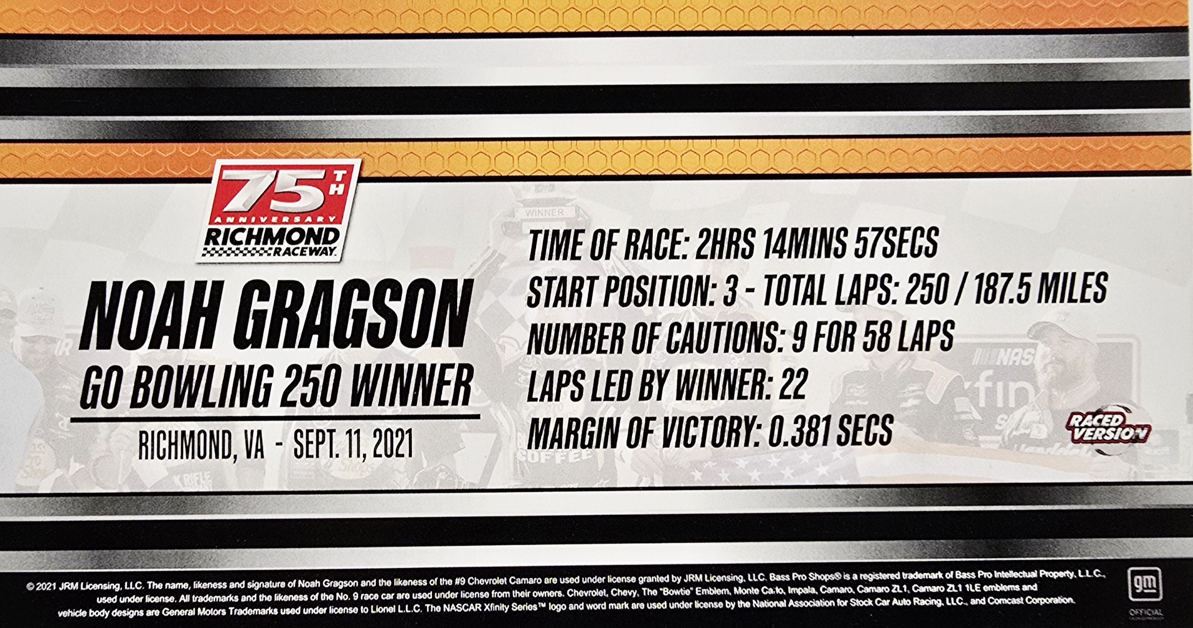 Limited edition of 612 made. JR Motorsports driver Noah Gragson made it two-in-a-row on an emotional weekend at Richmond Raceway. After leading the final 14 laps of the Go Bowling 250, Gragson put the No. 9 Bass Pro Shops/True Timber/Black Rifle Coffee Chevrolet in Victory Lane on the 20th anniversary of the September 11 terror attacks. The victory was Gragsons fourth in the NASCAR Xfinity Series and his second of the season, having won just the week prior at Darlington Raceway. The win also put him in third place on the playoff grid.