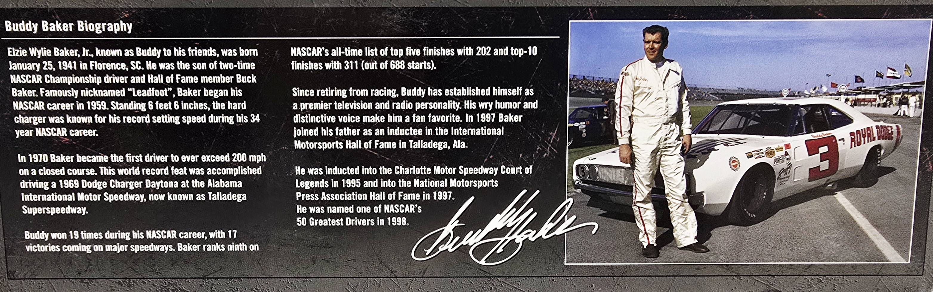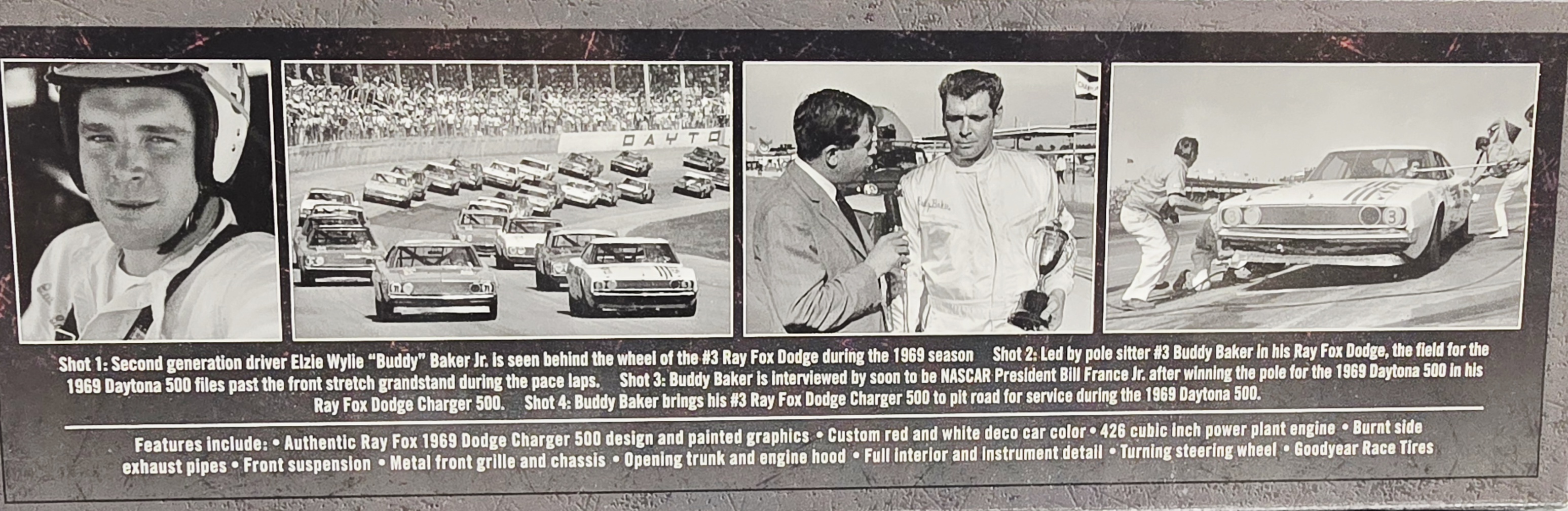 They just dont make drivers like Buddy Baker anymore. Baker, who passed away last August, was a second generation racer and a bona fide legend. He was also a man of firsts. Baker was the first driver to go 200 mph during NASCAR competition; and the first to win the four major races - Daytona, Talladega, Darlington and Charlotte. And in the 1969 Daytona 500, Bakers lead foot and his Ray Fox-owned No. 3 Dodge Charger powered him to the pole position, where he led the field in The Great American Race. Now, for the first time, Lionel Racing is excited to offer the neverbefore-made die-cast of Bakers Daytona pole-winning car. Produced by University of Racing, each of these cars is as authentic as they come from the burnt exhaust pipes to the detailed engine and full interior instrument detail.