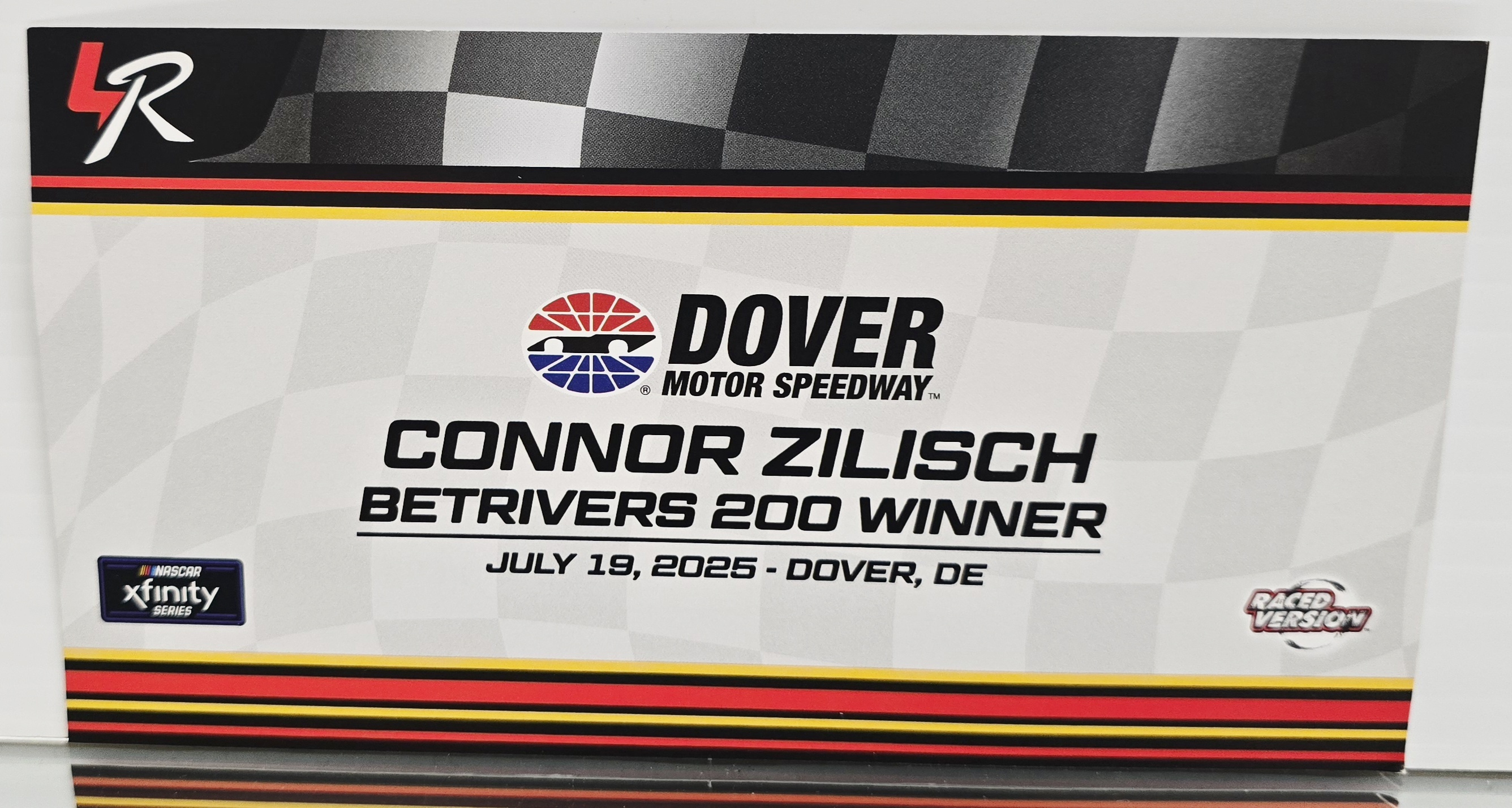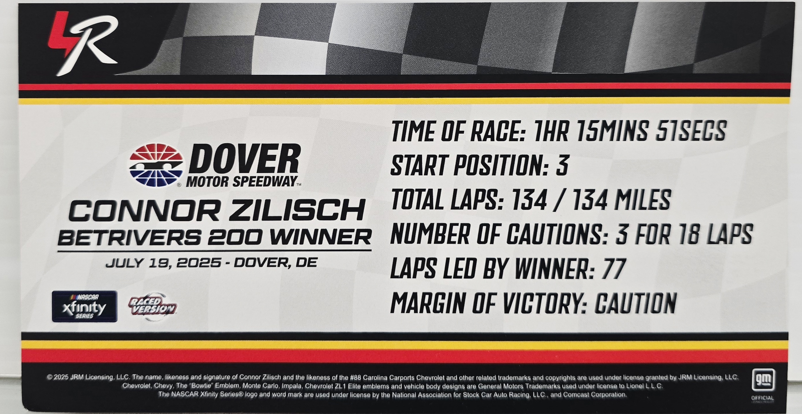 NASCAR Xfinity Series® rookie Connor Zilisch captured a series-best fourth victory of the 2025 season with a dominating performance in the rain-shortened BetRivers 200 at Dover. The JR Motorsports driver started third, but was in the hunt throughout. Zilisch took the lead for the final time following the Stage 2 restart and continued to show the way until rain forced the event to end at lap 134 of the scheduled 200. Fans can now celebrate Zilisch’s Dover victory with the official Lionel Racing Raced-Win die-cast of the No. 88 Carolina Carports Chevrolet.