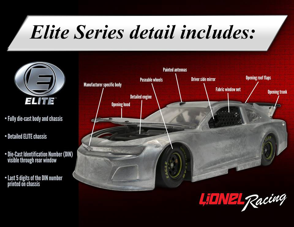 All diecast body and chassis; opening hood, trunk, and roof flaps; serialized DIN (diecast identification number); detailed deco body; painted chassis detail; posable wheels; fabric window net; driver side mirror; detailed Elite Chassis; detailed engine compartment; and more!