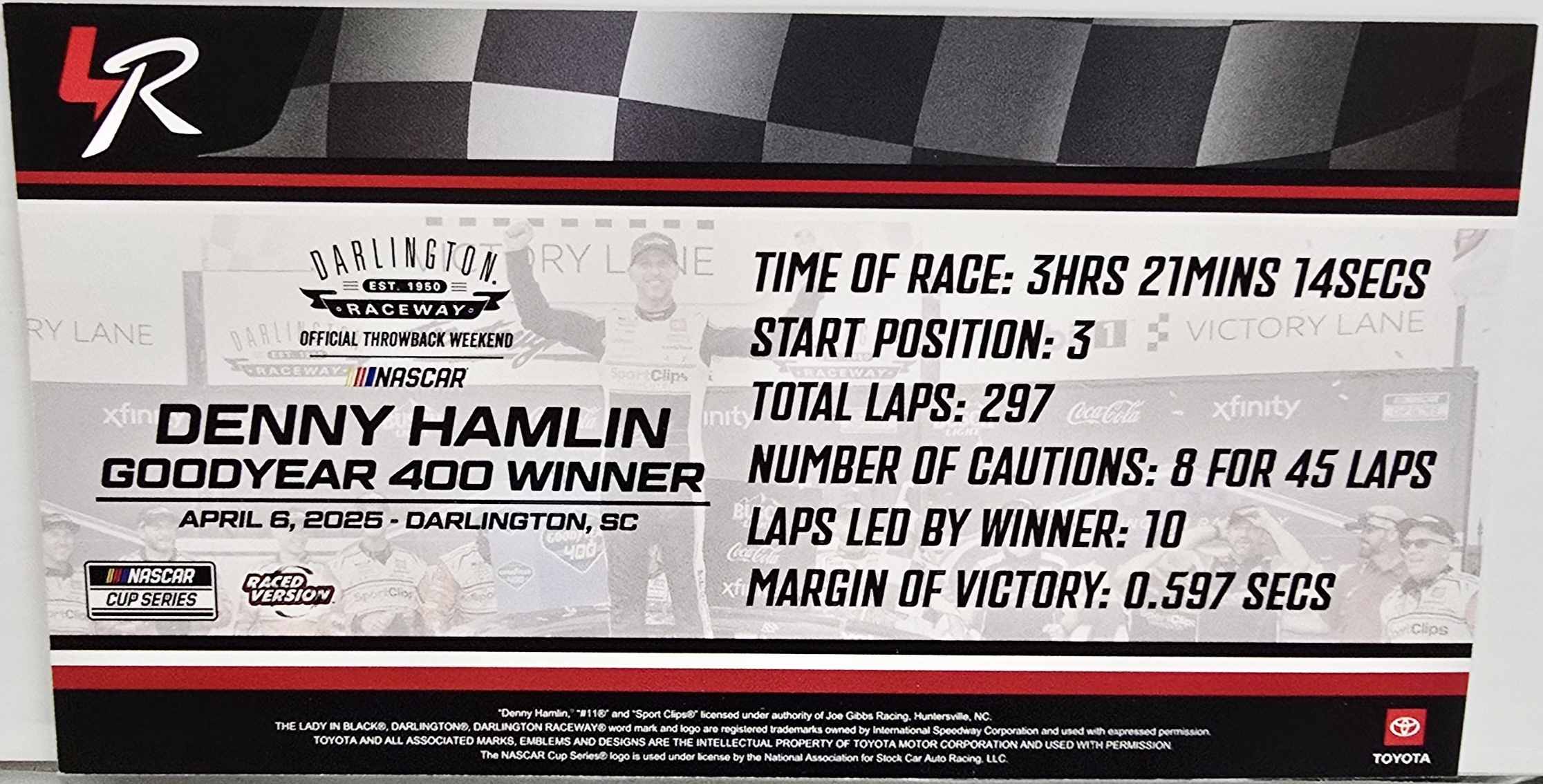 Joe Gibbs Racing driver Denny Hamlin benefitted from swift pit road work and a great launch on an Overtime restart during the Official Throwback Weekend of NASCAR® at Darlington to earn a