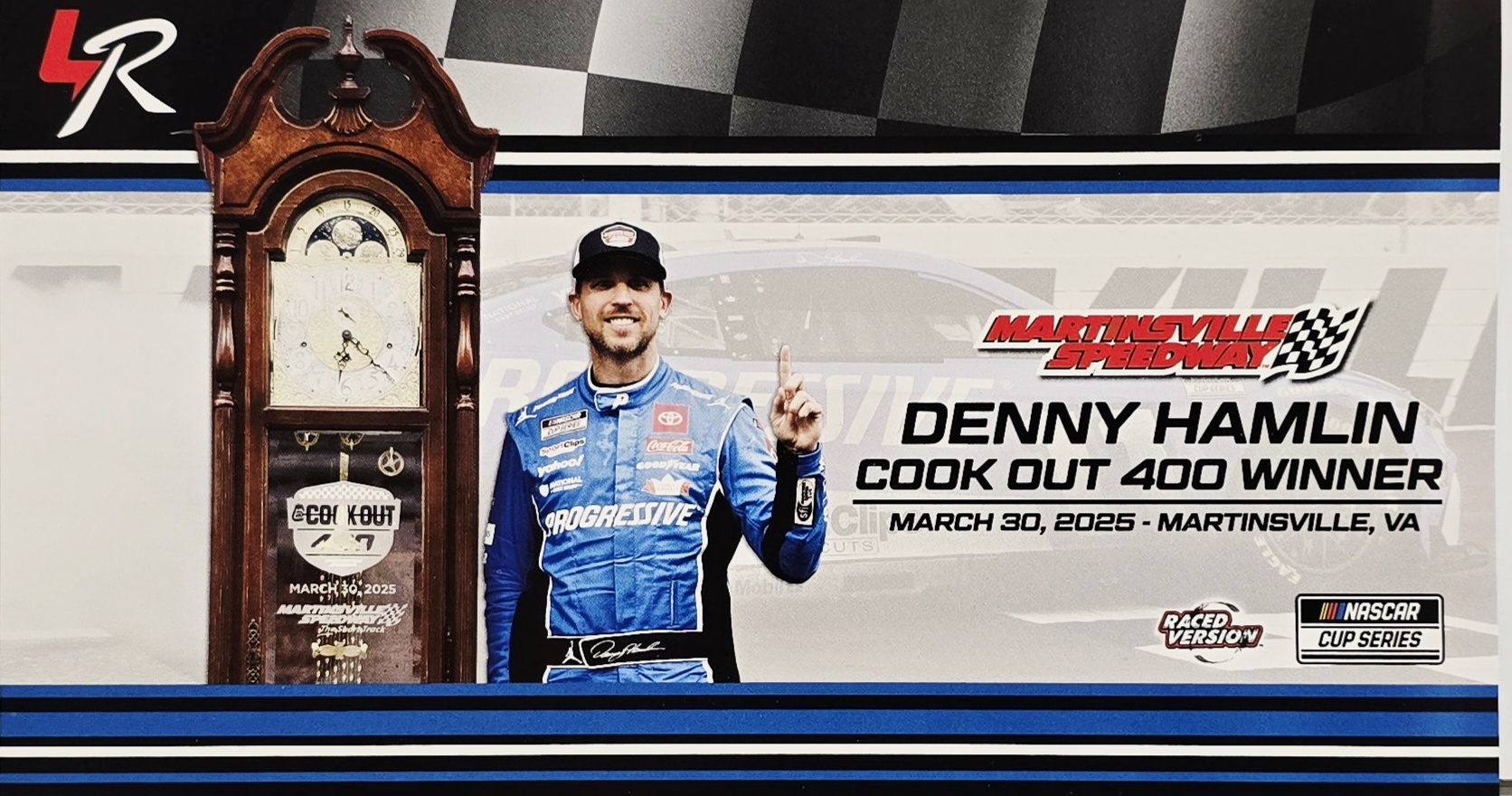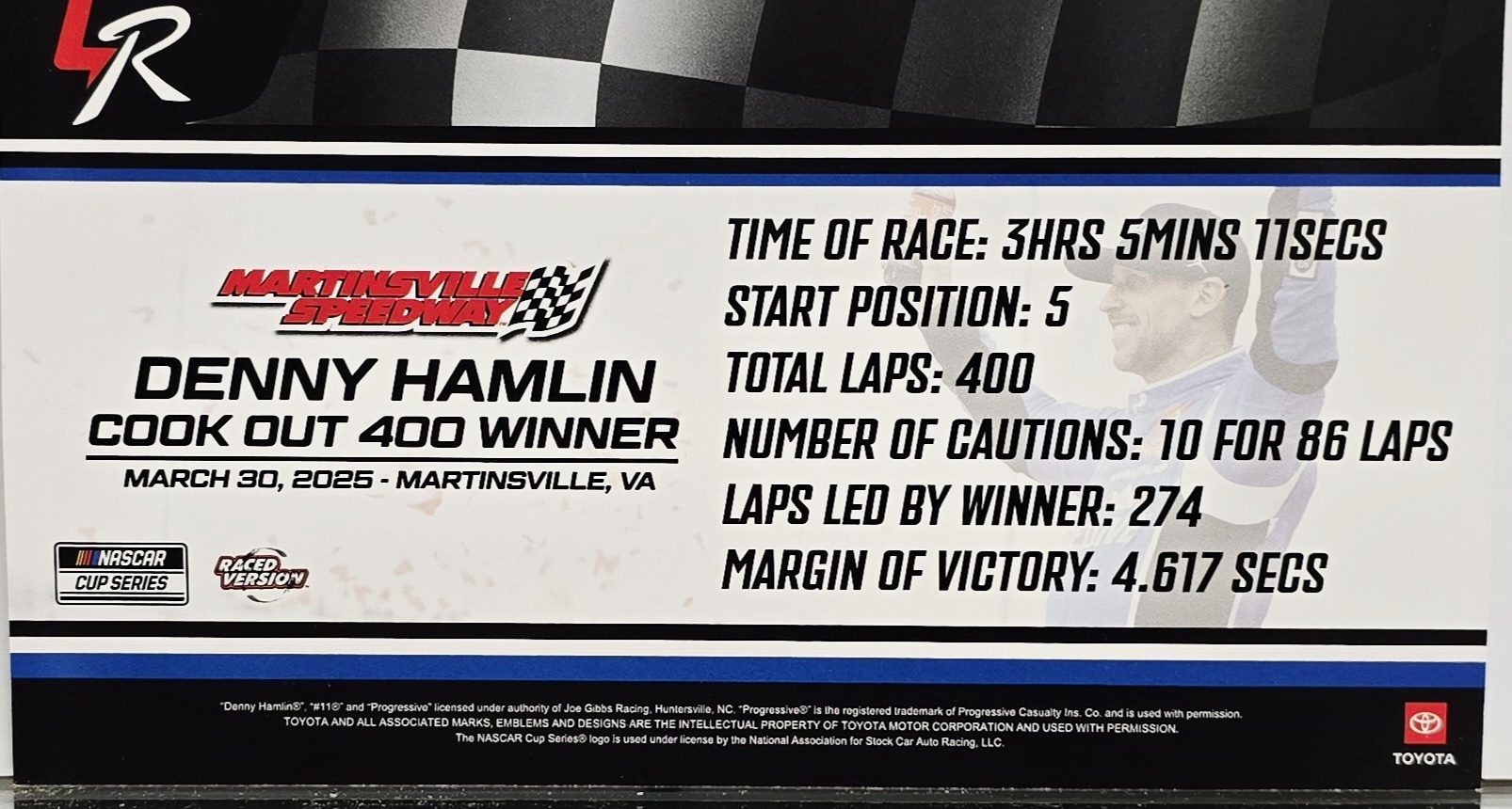 Limited edition of 660 made. Denny Hamlin took the lead of the Cook Out 400 on lap 126 and never looked back to earn his first win at Martinsville Speedwaysince 2015. Hamlin led all but one of the final 275 laps with his No. 11 Progressive Toyota Camry XSE and bested his Joe GibbsRacing teammate to the checkered flag by nearly five seconds.