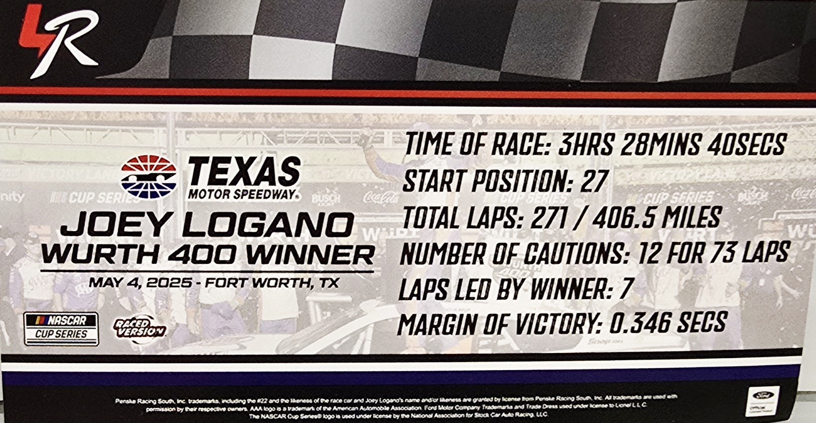 Defending NASCAR Cup Series® champion Joey Logano earned his first win of 2025 in Overtime at Texas Motor Speedway. Logano carved his way to the front late in the race and sped back to the lead on the final restart for his 37th career victory. Now, Lionel Racing is excited to offer NASCAR® fans the official Raced-Win die-cast of Logano’s No. 22 AAA Insurance Ford Mustang.