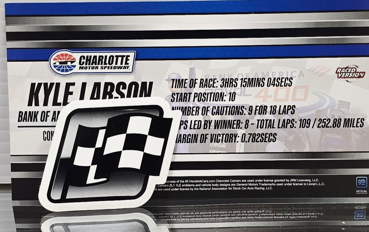 Limited edition of 1,332 made. Kyle Larson secured his spot in the Round of 8 of the 2021 NASCAR Cup Series Playoffs with a comeback victory at the Charlotte Motor Speedway ROVAL. Larson overcame an early electrical issue with his No. 5 HendrickCars.com Chevrolet Camaro to take the lead with just eight laps remaining. Larson cruised from there to the checkered flag, earning his seventh win of the season and his third on a road course. Fans can now celebrate Larsons triumph with the official Lionel Racing Raced-Win die-cast of the No. 5 HendrickCars.com Chevrolet. Each replica car is produced with rolling Goodyear tires and all the damage and race markings seen on Larsons winning car in Victory Lane. Each 1:24-scale die-cast also comes with a full-color collector card detailed with race stats and an official, actual-size NASCAR Winner sticker. All versions of this raced-win die-cast will also be produced with a pink window net as run on the track. This Larson die-cast will be produced in in a limited edition, so dont wait. Reserve yours now!