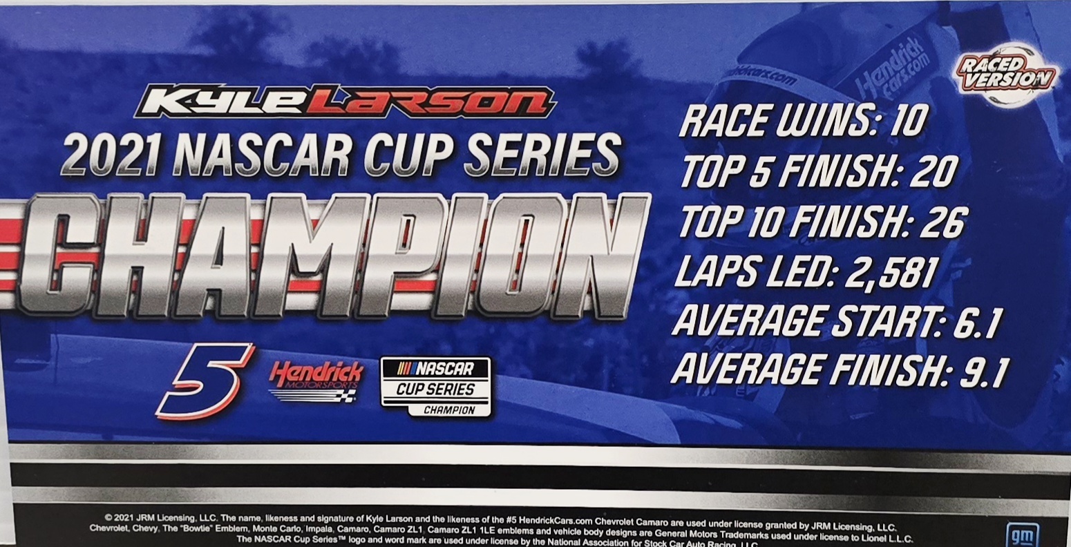 and Championship car: Limited edition of 4,488 made. Hendrick Motorsports driver Kyle Larson clinched the 2021 NASCAR Cup Series™ championship after a thrilling showdown at Phoenix Raceway! Wheeling the No. 5 HendrickCars.com Chevrolet Camaro, Larson put it all on the line to earn his first NASCAR Cup Series™ title and cap off an incredible 2021 season. Now Lionel Racing – The Official Die-Cast of NASCAR® – presents the die-cast that commemorates Larson’s 2021 NASCAR Cup Series™ championship.