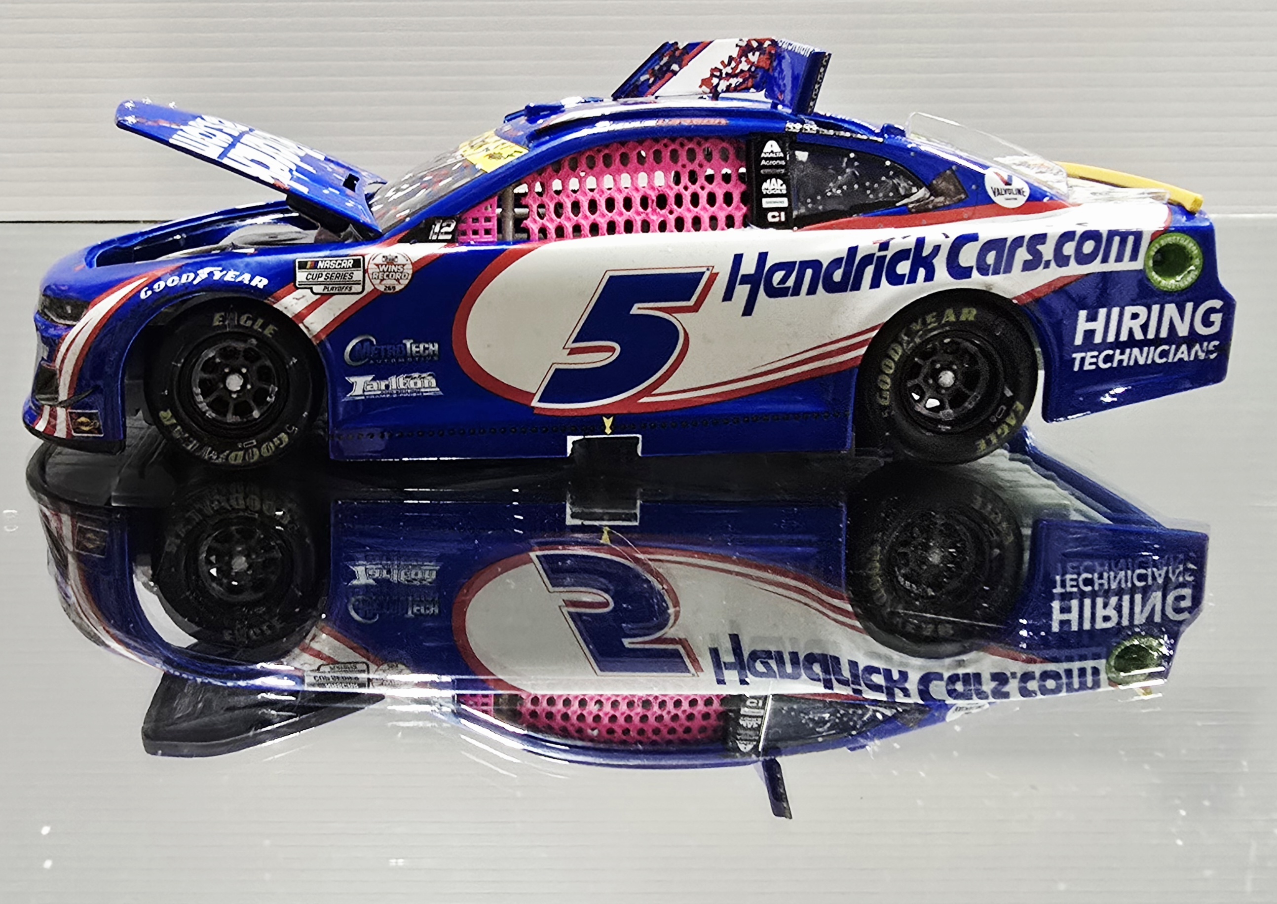 Roval win: Limited edition of 1,332 made. Kyle Larson secured his spot in the Round of 8 of the 2021 NASCAR Cup Series Playoffs with a comeback victory at the Charlotte Motor Speedway ROVAL. Larson overcame an early electrical issue with his No. 5 HendrickCars.com Chevrolet Camaro to take the lead with just eight laps remaining. Larson cruised from there to the checkered flag, earning his seventh win of the season and his third on a road course. Fans can now celebrate Larsons triumph with the official Lionel Racing Raced-Win die-cast of the No. 5 HendrickCars.com Chevrolet. Each replica car is produced with rolling Goodyear tires and all the damage and race markings seen on Larsons winning car in Victory Lane. Each 1:24-scale die-cast also comes with a full-color collector card detailed with race stats and an official, actual-size NASCAR Winner sticker. All versions of this raced-win die-cast will also be produced with a pink window net as run on the track. This Larson die-cast will be produced in in a limited edition, so dont wait. Reserve yours now!