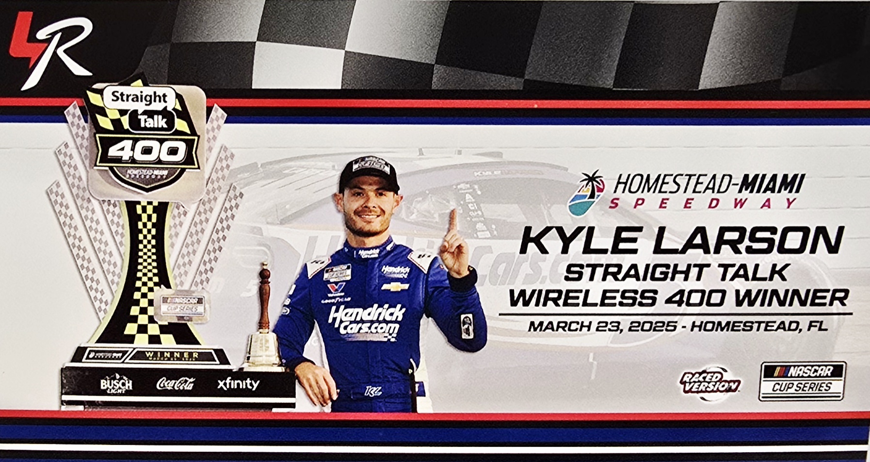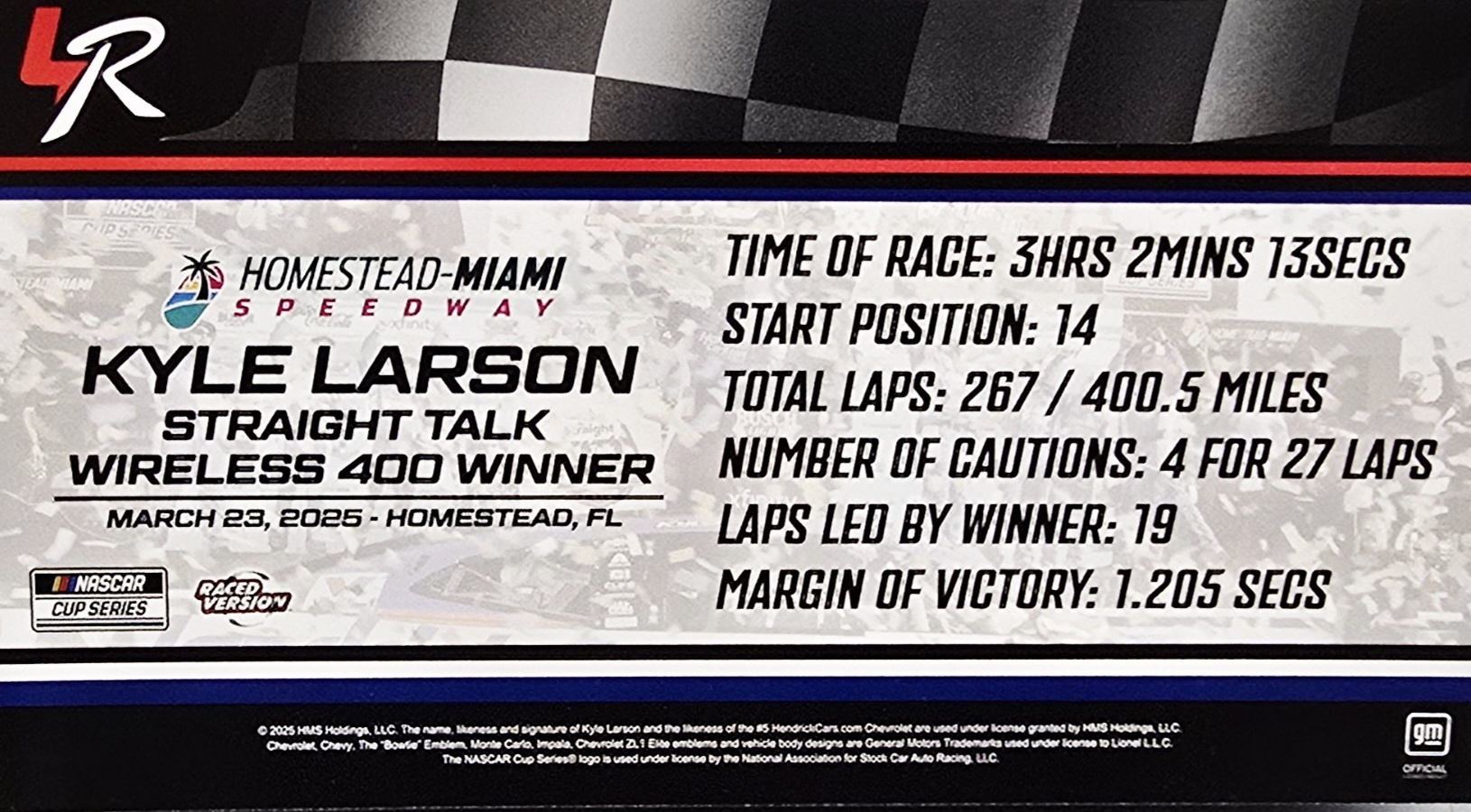 Limited edition of 264 made. Kyle Larson swept past a Hendrick Motorsports® teammate with six laps to go in the Straight Talk Wireless 400 at Homestead-Miami Speedway to score his first NASCAR Cup Series® victory of 2025. The win capped off an incredible weekend for the driver of the No. 5 HendrickCars.com Chevrolet, as Larson won Friday’s NASCAR Craftsman Truck Series® race and led the most laps in Saturday’s NASCAR Xfinity Series® event. Now, Lionel Racing is excited to offer NASCAR® fans the official Raced-Win die-cast of Larson’s Homestead-winning No. 5 HendrickCars.com Chevrolet. Produced on Lionel Racing’s Chevy tool, each die-cast recreates all the scuffs, markings, and confetti seen on Larson’s winning car in Victory Lane.