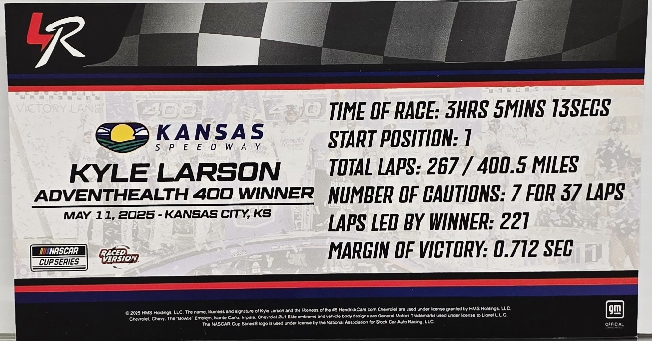 Kyle Larson put on an ultimate display of strength in the AdventHealth 400 at Kansas Speedway. The driver of the No. 5 HendrickCars.com Chevrolet earned his third NASCAR Cup Series® victory of the season by leading 221 of the race’s 267 laps from the pole. Now, Lionel Racing is excited to offer NASCAR® fans the official Raced-Win die-cast of Larson’s No. 5 HendrickCars.com Chevrolet. Produced on Lionel Racing’s Chevy tool, each die-cast recreates all the scuffs, markings, and confetti seen on Larson’s winning car in Kansas Victory Lane