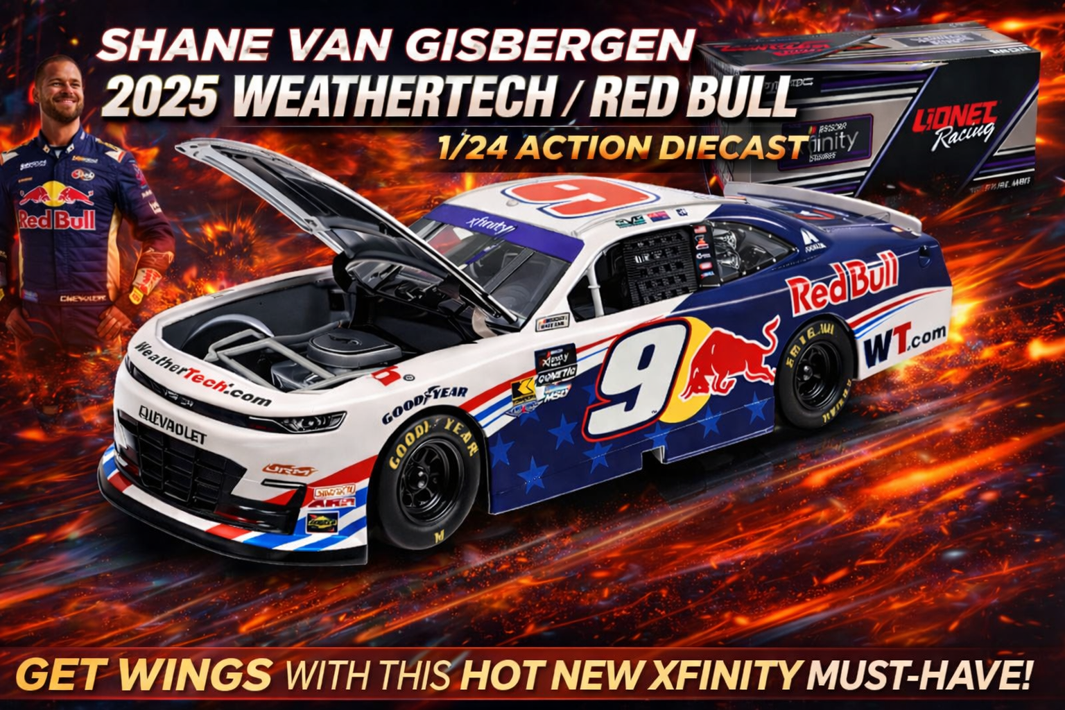 Fans can add 1:24 and 1:64-scale individual offerings of van Gisbergen’s No. 9 as well as Zilisch’s No. 88 Chevrolets. Produced on Lionel Racing’s NASCAR Xfinity Series®