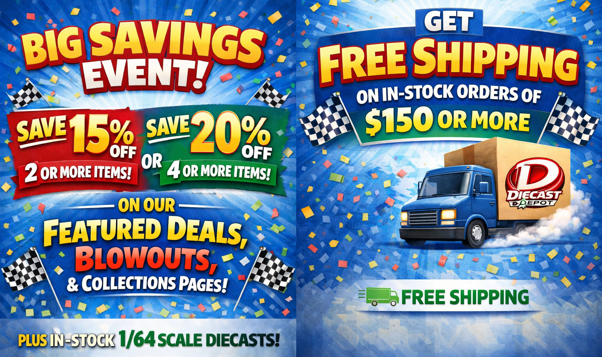 *Save 15% off 2+, or 20% off 4+ items from our Collections, Blowouts, Featured Deals, and in-stock 1/64 scale pages!