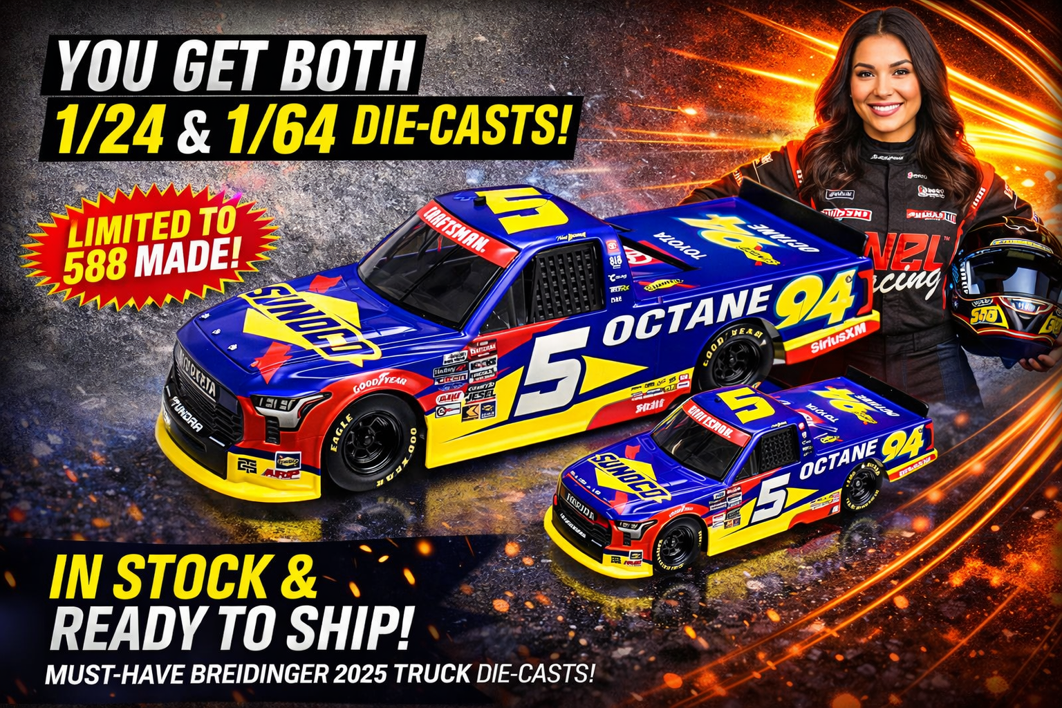With a strictly limited production of just 588 pieces for the 1/24 scale, this combo is a must-have for Toni Breidinger fans and NASCAR® die-cast collectors alike.