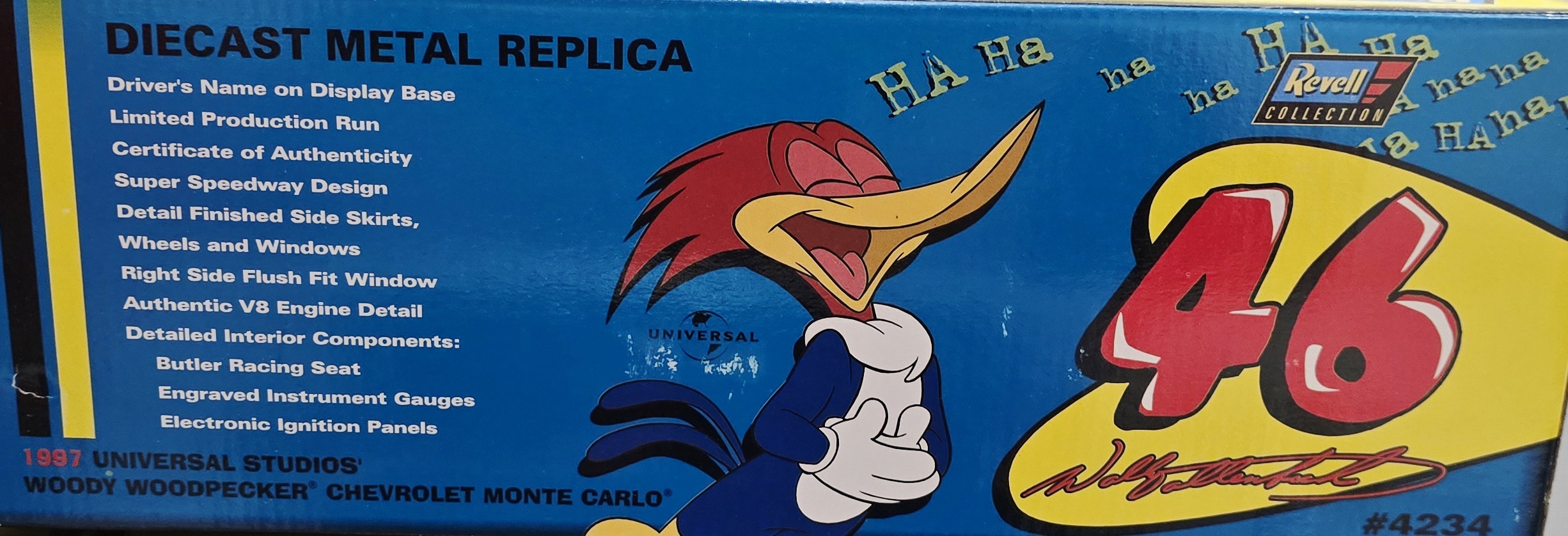 Revell’s 1/18 lineup delivers impressive detail and size, complete with opening parts, a fully detailed engine bay, realistic interior features, and crisp sponsor/cartoon graphics throughout. The bold Woody Woodpecker artwork makes this car instantly stand out and has made it a long-time favorite among collectors of character-themed NASCAR diecasts.