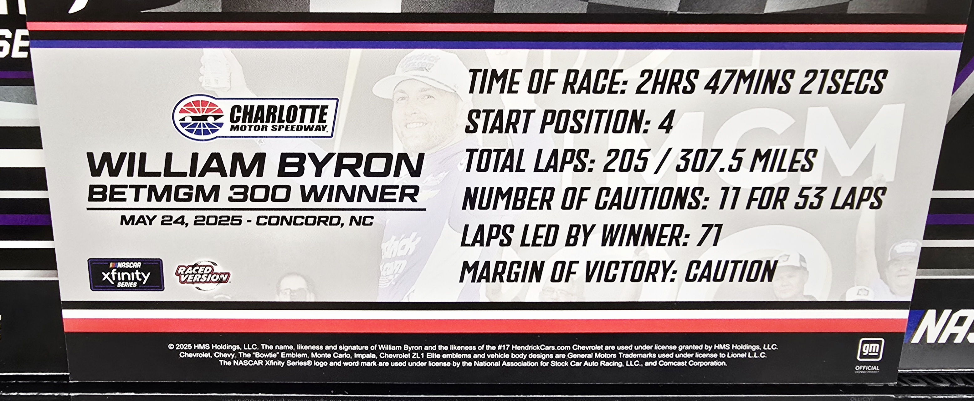 Limited edition of 528 made. Hendrick Motorsports® star William Byron scored an Overtime NASCAR Xfinity Series® victory in dramatic fashion at Charlotte Motor Speedway. Byron had to overcome a pit road speeding penalty in the second stage and utilized a late-race pit stop for tires to put himself in position to pounce in the closing laps. Byron took the lead for the final time on the Overtime restart and held on for his first NASCAR Xfinity Series® win of the 2025 season in just his second start. Fans can now celebrate Byron’s victory with the official Lionel Racing Raced-Win die-cast of the No. 17 HendrickCars.com Chevrolet.