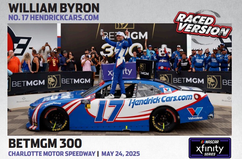 Hendrick Motorsports® star William Byron scored an Overtime NASCAR Xfinity Series® victory in dramatic fashion at Charlotte Motor Speedway. Byron had to overcome a pit road speeding penalty in the second stage and utilized a late-race pit stop for tires to put himself in position to pounce in the closing laps. Byron took the lead for the final time on the Overtime restart and held on for his first NASCAR Xfinity Series® win of the 2025 season in just his second start. Fans can now celebrate Byron’s victory with the official Lionel Racing Raced-Win die-cast of the No. 17 HendrickCars.com Chevrolet.