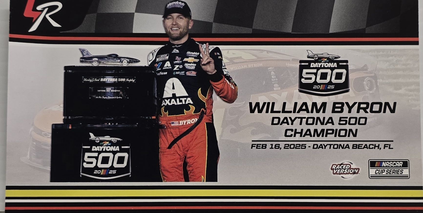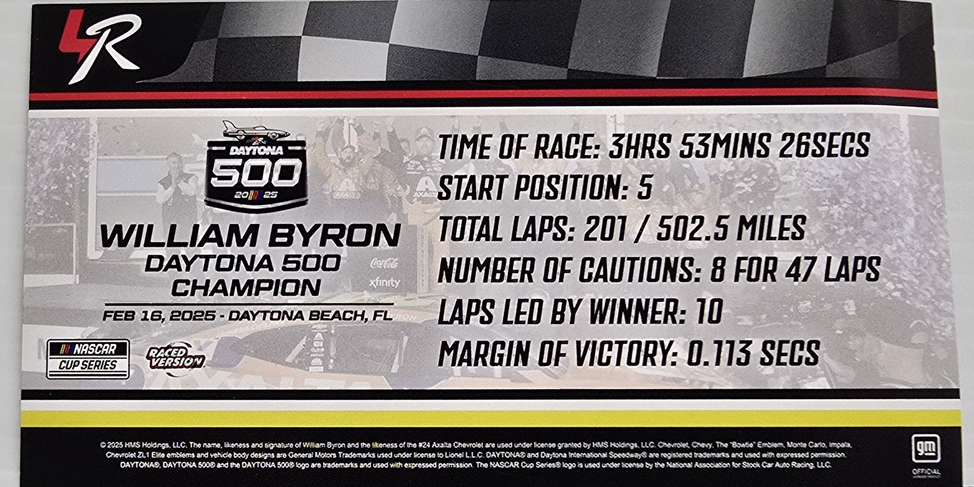Limited edition of 742 made. William Byron came from ninth to first on the final lap of the 67th running of the DAYTONA 500® and took the checkered flag first for his second-straight victory in the “Great American Race.” Now, Lionel Racing is excited to offer NASCAR® fans the official Raced-Win die-cast of Byron’s No. 24 Axalta Chevrolet. Produced on Lionel Racing’s NASCAR Cup Series® Chevrolet tool, each die-cast recreates all the scuffs, markings, and confetti seen on Byron’s winning car in DAYTONA® Victory Lane.